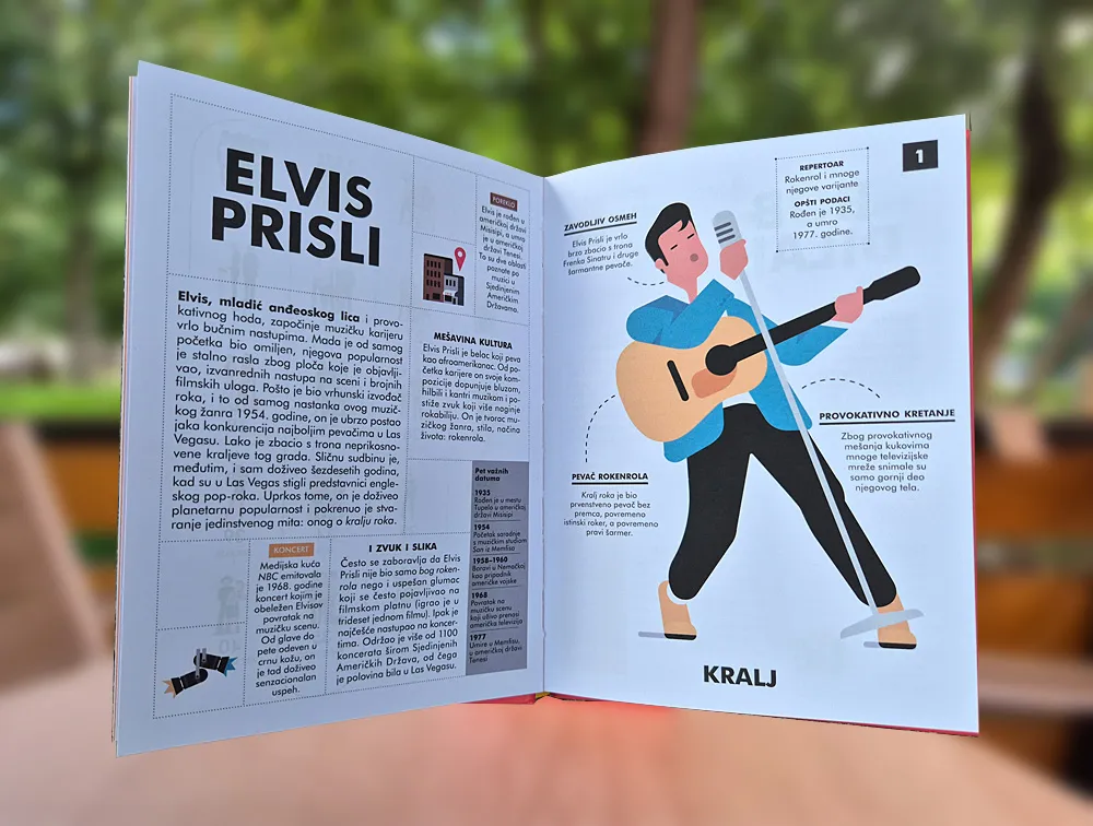 Knjiga za vikend, Kultura Knjiga za vikend: LEGENDE POP-ROKA 19/09/2025 Još iz kategorije Knjiga za vikend: Knjiga za vikend: Roman kao ogledalo epohe 10/10/2025 Knjiga za vikend: TESLINA AUTOBIOGRAFIJA 03/10/2025 Knjiga za vikend: NEUSTRAŠIV MOREPLOVAC 26/09/2025 KNJIGA ZA VIKEND – Knjiga „Pop-rok: 40 legendarnih izvođača i muzičkih grupa” o muzici koja je oblikovala generacije otkriva priče iza najvećih hitova i preporučujemo je za čitanje tokom vikenda. Štivo u izdanju„Kreativnog centra” podjednako je korisno za ljubitelje muzike, za đake koji žele da nauče više o kulturi 20. veka, ali i za sve koji traže inspiraciju u pričama o talentu, upornosti i stvaralaštvu. Uz bogat pregled od ranog rokenrola do savremenih muzičkih pravaca, ova knjiga nas vodi kroz biografije, diskografiju i najznačajnije nastupe onih koji su ispisali istoriju moderne muzike. Ona je više od muzičke enciklopedije, pravo blago za sve generacije. Mladi čitaoci mogu da upoznaju početke roka i popa, dok će stariji uživati u podsećanju na svoje muzičke idole. Zastupljene su rok i pop ikone kao što su Elvis Prisli, kralj rokenrola koji je zauvek promenio muziku, Bitlsi, bend koji je promenio lice muzike i postao glas čitave generacije i čiji je uticaj daleko nadmašio granice popularne kulture, Aba(ABBA) švedski globalni fenomen čije pesme i danas pevaju sve generacije čiji put vodi od pobede na Evroviziji do kultnih filmova i mjuzikla. Svaki izvođač ili grupa ima svoju strukturisanu rubriku, koja sadrži biografski prikaz, uvod o životu i počecima umetnika, ključne osobine i stil, o tome šta ih čini jedinstvenim. Recimo, istaknuto je kako je Elvis Prisli promeniio muzičku industriju, postajući simbol jedne ere, dok rubrike o koncertima i filmovima otkrivaju da je Elvis bio višeslojan umetnik. Zanimljivosti daju detalje koji privlače pažnju mladih čitalaca (npr. cenzura Elvisovih nastupa na TV-u zbog provokativnog kretanja ili Abina pesma na više jezika kao primer kako jedna grupa može prevazići nacionalne granice). Priča o Bitlsima objašnjava kako je grupa iz Liverpula promenila ne samo muziku, već i društvo. Oni su pioniri koji su uneli nove muzičke forme, studijski eksperiment i konceptualne albume. Deca i mladi mogu kroz njih da uče o šezdesetim godinama, kontrakulturi i pokretima za mir i slobodu. Rubrike o njihovim najpoznatijim albumima (Sgt. Pepper, Abbey Road) i koncertima pomažu da se shvati razvoj pop muzike. Uvid u njihov društveni angažman i kreativnost podstiče čitaoce da muziku posmatraju i kao umetnički izraz i kao sredstvo promene. Biografija Bijonse pokazuje uspon savremene pop zvezde, od Destiny’s Child do solo karijere. To je priča o disciplini, radu i stvaranju globalnog brenda. Njene pesme i nastupi otvaraju teme feminizma, rasne ravnopravnosti i moći umetničkog izraza. Rubrike o njenim koncertima i vizuelnim albumima pokazuju kako muzika danas spaja ples, modu, film i digitalne medije. Otkriva ko je uticao na stvaranje njenog muzičkog izraza. Za svakog je izabrano pet važnih datuma kroz koje se prikazuje hronologija najbitnijih trenutaka u karijeri, ističe se kulturni uticaj i nasleđe, šta su ostavili iza sebe, kako i danas živi njihova muzika. Obuhvaćeno je 40 godina, pa su svoje mesto našle i savremene zvezde, kao što je U2, irska grupa poznata po snažnim tekstovima i društvenom angažmanu, Bijonse, simbol moderne pop muzike i inspiracija milionima i druge. Na stranicama ove knjige naći ćete izbor najvećih albuma, hitova i kultnih koncerata, ali i zanimljivosti o umetnicima i društvenom uticaju tih zvezda. Knjiga je idealna za ljubitelje muzike, kao i za sve koji žele da bolje razumeju kako su zvezde popa i roka oblikovale ne samo muziku, već i čitavu kulturu. Zašto da pročitate ovu knjigu? Zato što je vodič kroz istoriju XX i XXI veka, pokazuje kako se rađao moderni šou-biznis; Zato što je zbirka priča o simbolima jedne ere i o tome kako umetnost menja društvo, Zato što je inspiracija za nove generacije da muziku vide kao deo kulture i identiteta. Ova knjiga je pravo putovanje kroz istoriju muzike – od rađanja rokenrola pedesetih godina, preko zlatnog doba popa i roka šezdesetih i sedamdesetih, pa sve do savremenih pop ikona koje oblikuju današnji svet. Autor knjige je Erve Gijmino, a ilustrator Žerom Masi. „Pop-rok: 40 legendarnih izvođača i muzičkih grupa” pruža uvid u to kako su pesme i izvođači oblikovali čitave epohe. Kroz priče o legendarnim muzičarima čitaoci svih generacija mogu upoznati ne samo razvoj popularne muzike, već i širu kulturnu i društvenu istoriju poslednjih decenija. To je knjiga koja jednako inspiriše ljubitelje muzike, učenike, profesore i sve koji žele da razumeju kako su pesme oblikovale svet u kome živimo. „Pop-rok: 40 legendarnih izvođača i muzičkih grupa” knjiga koju ćete čitati uz omiljenu pesmu i u kojoj ćete uvek otkrivati nešto novo. Prof. dr Slađana Milenković
