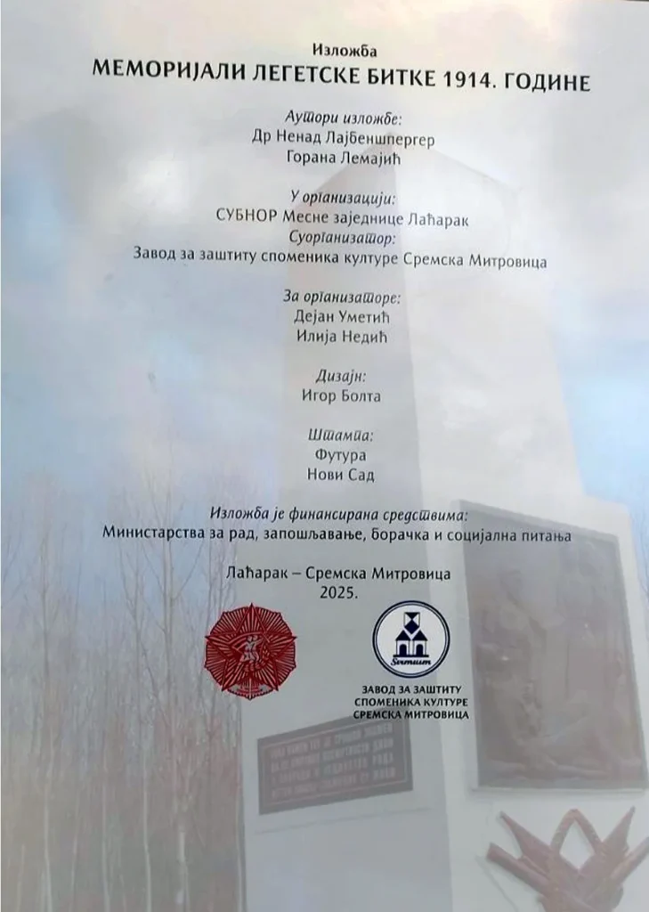 Kultura Otvorena izložba o bitci na Legetu i njenom spomeničkom nasleđu 25/11/2025 Još iz kategorije Kultura: Edukacija za snažniju turističku ponudu u Sremu 26/11/2025 Prestižno pokrajinsko priznanje za Galeriju 26/11/2025 „Vinski park” od danas sa ponosom nosi prestižnu oznaku „Najbolje iz Vojvodine” 24/11/2025 RUMA – U Sali Kulturnog centra „Brana Crnčević” u Rumi, otvorena je izložba pod nazivom „Memorijali Legetske bitke 1914”. Pored toga što je predstavljen sam događaj, značajan deo je posvećen kasnijem spomeničkom nasleđu koje je postepeno nastajalo. Centralni spomenik predstavlja obeležje na mestu same bitke polju Legetu. Vojnička groblja poginulih boraca obe strane smeštena su na samom mestu bitke, kao i u Sremskoj Mitrovici, Šašincima i Rumi. Tokom bitke na obe strane poginulo je preko dve hiljade vojnika. Autori postavke su, istoričari dr Nenad Lajbenšperger i msr Gorana Lemajić. Organizatori izložbe su SUBNOR Mesne zajedice Laćarak i Zavod za zaštitu spomenika culture u Sremskoj Mitrovici. Očekuje se da će ova izložba biti postavljena u Novom Sadu, Sremskoj Mitovici nekim drugim mestima.