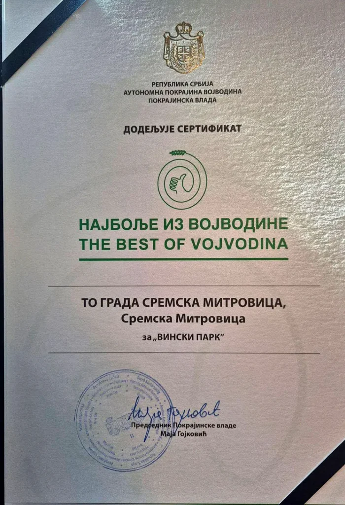 Kultura „Vinski park” od danas sa ponosom nosi prestižnu oznaku „Najbolje iz Vojvodine” 24/11/2025 Još iz kategorije Kultura: Knjiga za vikend: ZAGONETKE ZA PREDŠKOLCE 21/11/2025 „Vinski park” u Carskoj palati: Noć vina u srcu antičke Mitrovice 20/11/2025 Radionica „Imam pravo da čitam, pišem i slikam ćirilicu” 20/11/2025 NOVI SAD – Danas je u Privrednoj komori Vojvodine predsednica Pokrajinske vlade Maja Gojković svečano dodelila ovo priznanje Turističkoj organizaciji grada Sremska Mitrovica, čime je naša manifestacija svrstana među najkvalitetnije projekte u Vojvodini. Za nas, to je potvrda da “Vinski park” nije samo događaj — već iskustvo koje spaja tradiciju vinarstva, kulturu i jedinstveni duh Srema.