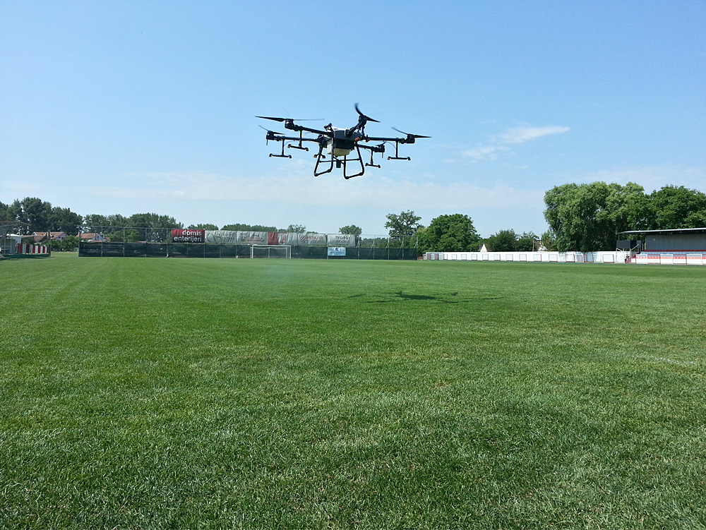 Demonstrirana je primena letećih robota ili dronova za tretmane u održavanju fudbalskih terena koji zahtevaju posebnu i pažljivu negu, programiranih da obavljaju određene poslove iz vazduha u poljoprivredi i uopšte tretiranju biljaka. Prednost je što se tretman može izvršiti tačno kada je potrebno, a ne kada eventualno to omoguće kiša, drenaža i ceđenje terena.