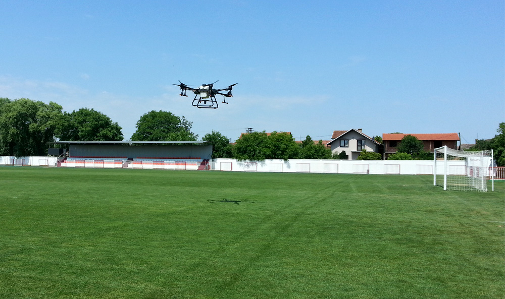 Agrodron može da se veoma efikasno koristi za održavanje fudbalskih terena, to je danas praktično pokazano na stadionu FK „Radnički”. Ova tehnologija omogućava sjajne ekološke, veoma male rizike jer se može u mililitar precizno planirati gde i koliko će se sredstva plasirati.