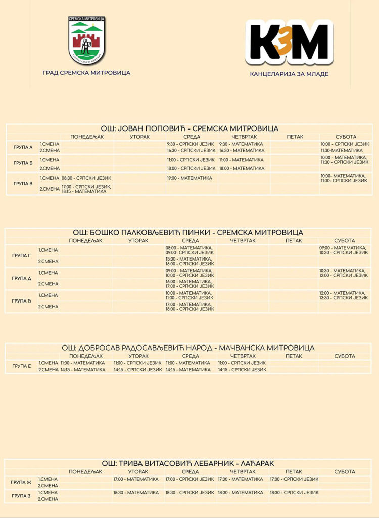 Vesti Besplatna priprema za polaganje male mature 22/03/2023 Još iz kategorije Vesti: Noćas počinje zimsko računanje vremena 25/10/2025 Epidemiološka situacija gripa na teritoriji Sremskog okruga 24/10/2025 Novi podovi u svim učionicama u Bajićevoj školi 24/10/2025 Sremska Mitrovica – Kancelarija za mlade uz podršku Grada Sremska Mitrovica, organizuje besplatnu pripremnu nastavu za polaganje male mature iz srpskog jezika i matematike. Nastava je počela danas u četiri osnovne škole. Grad Sremska Mitrovica i Kancelarija za mlade organizuje besplatan program pripremne nastave, sa ciljem da se učenicima pomogne u ostvarivanju što boljih rezultata na prijemnom ispitu i upisu u željene srednje škole. Ovom inicijativom Kancelarija za mlade pokazala je društvenu odgovornost, prema rečima Vladimira Pavlovića, predsednika Skupštine Grada. Kako je dodao: „Sve pohvale Kancelariji za mlade, kao mnogo puta do sada pokazala je društvenu odgovornost i sa ovom besplatnom pripremnom nastavom za male maturante. Pozvao je sve mlade ljude od 15 do 30 godina da dođu u prostorije kancelarije gde će da razmenjuju ideje, kao što je ova ideja, a Grad će uvek biti tu da ih realizuje. Osim što Kancelarija za mlade služi za promociju ideja mladih, služi i tome da se mladi uče društvenoj odgovornosti, a ovo je pravi primer za to.” Realizacijom besplatne pripremne nastave pomaže se roditeljima da ne plaćaju privatne časove, a đacima se pruža priliku da se adekvatno pripreme kako bi upisali željene škole. Zato im je Pavlović poručio da budu vredni, istrajni i rezultati sigurno neće izostati i poželeo puno sreće na polaganju mature i upisu. Biljana Matić, koordinatorka Kancelarije za mlade rekla je da pripremna nastava počinje od danas, tačnije, srede, 22. marta sa početkom u 15 časova, u četiri osnovne škole: u Laćarku u OŠ „Triva Vitasović Lebarnik”, u Mačvanskoj Mitrovici u OŠ „Dobrosav Radosavljević – Narod”, a u gradu u osnovnim školama „Jovan Popović“ i „Boško Palkovljević Pinki”. Matićka je dodala da ima ukupno 289 prijava, urađeni su rasporedi predavanja, a grupe su raspoređene prema srednjoj oceni iz srpskog jezika i matematime. U Gradskoj kući organizovan je sastanak sa roditeljima učenika koji su se prijavili za pripremnu nastavu i dogovoren je raspored nastave. Pravila o polaganju završnog ispita u okviru osmogodišnje škole, odnosno tzv. male mature menjala su se iz godine u godinu, tako da sada osmaci polažu tri testa. Pripremna nastaava je besplatna za sve učenike osmih razreda sa teritorije Grada. Profesor srpskog jezika i književnosti Dobrila Gmizić izrazila je zadovoljstvo što učestvuje u ovom projektu, ističući da je svaki dodatni rad sa decom dobrodošao, posebno u ovom uzrastu, gde su oni u najdelikatnijem delu života, kada se opredeljuju za određenu srednju školu, čime usmeravaju svoj život. Pripremna nastava predstavlja mogućnost da učenici dopune svoje znanje i utvrde ono što su već naučili. Branislav Cvetinčanin otac Ane Cvetinčanin koja je učenica Osnovne škole „Branko Radičević” iz Kuzmina zahvalio se lokalnoj samoupravi na ovom gestu: „Dete je spremno u svakom slučaju, a što se tiče kućnog budžeta ovo puno znači jer su to ozbiljni izdaci, ovim potezom Grada biće ozbiljna ušteda. Želim da se zahvalim Gradu tj. lokalnoj samoupravi na pažnji posvećenoj deci.” Sve dodatne informacije roditelji mogu dobiti u prostorijama Kancelarije za mlade, Svetog Dimitrija br. 10, putem telefona: 022/618-276, kao i putem društvenih mreža Kancelarije za mlade.