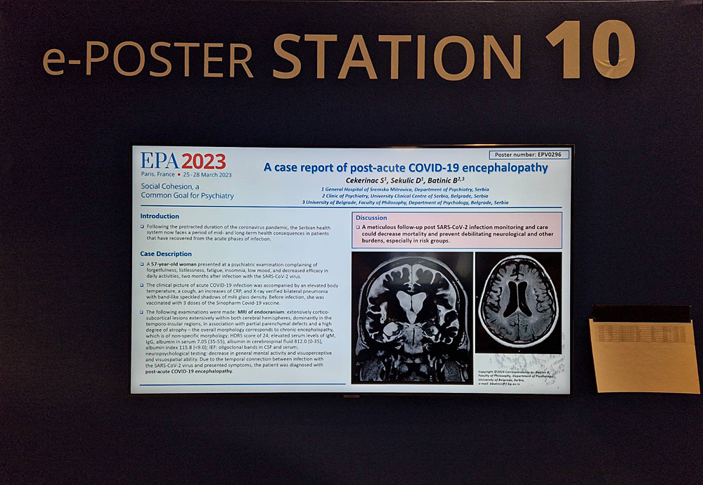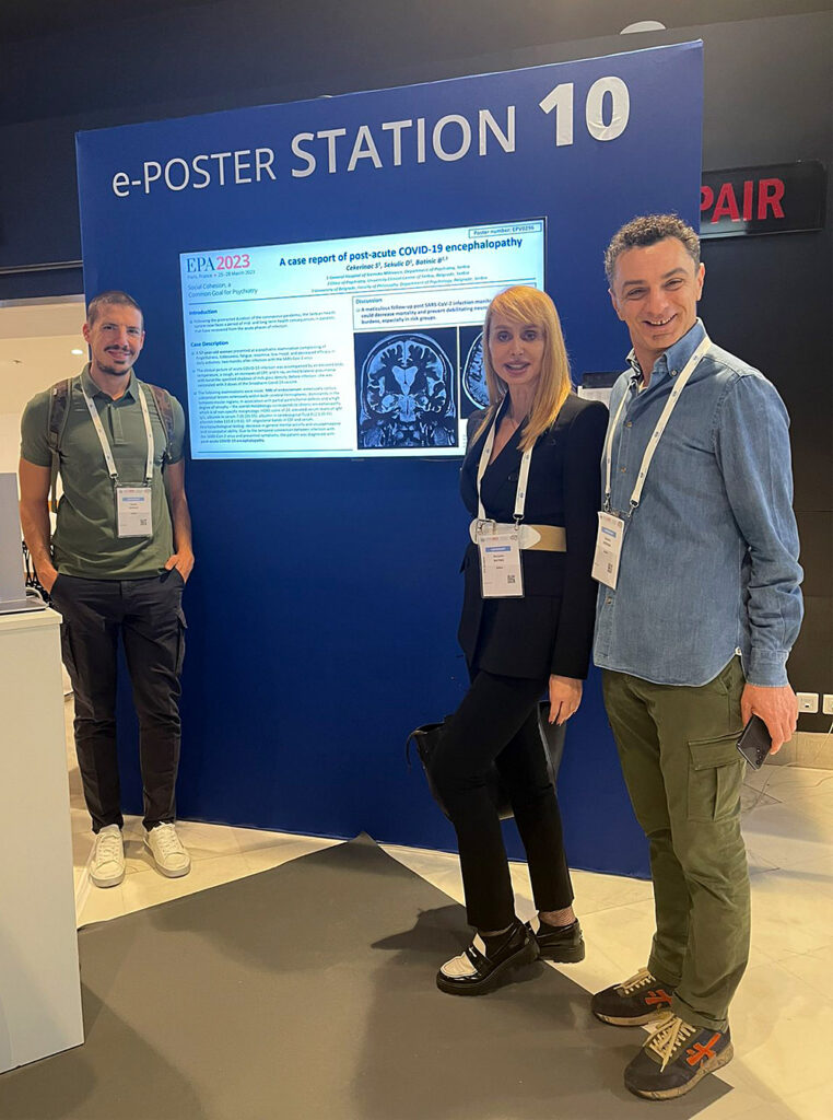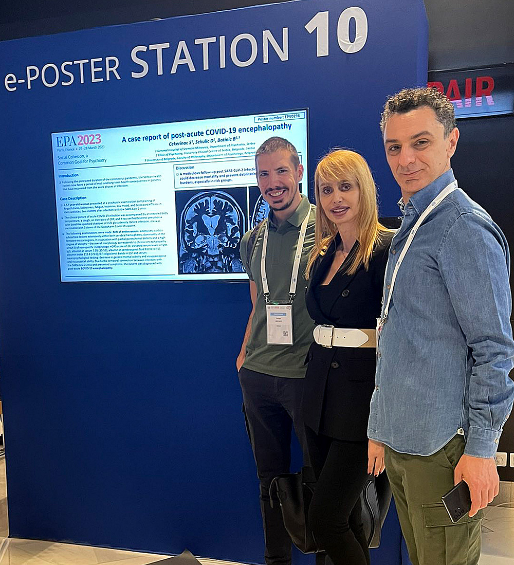 Vesti Dr Stanimir Čekerinac učesnik Evropskog kongresa psihijatara u Parizu 31/03/2023 Još iz kategorije Vesti: Noćas počinje zimsko računanje vremena 25/10/2025 Epidemiološka situacija gripa na teritoriji Sremskog okruga 24/10/2025 Novi podovi u svim učionicama u Bajićevoj školi 24/10/2025 Sremska Mitrovica – Proces kontinuirane edukacije u mitrovačkoj Opštoj bolnici veoma je zastupljen i intenzivan i poznato je da lekari aktivno učestvuju na domaćim i međunarodnim Kongresima sa zapaženim radovima. U vreme intenzivnog trajanja epidemije izazavne korona virusom, takve edukacije bile su organizovane online, ali se svakako za novim dostignućima i razmenama iskustava nije stajalo. Veliki međunarodni Kongres psihijatara ( EPA 2023) održan je od 25.do 28.marta u Francuskoj, u Parizu i okupio je specijaliste psihijatrije iz celog sveta, posle dve godine pauze zbog poznate epidemiloške situacije. Predavači su govorili o raznim psihijatrijskim temama, kako o savremenom lečenju shizofrenije, tako i o upotrebi kanabisa u psihijatrijske svrhe, pojavi novih psihijatrijskih lekova na tržištu, upotrebi esketamina u terapiji teraporezistentne depresije, transkranijalnoj magnetnoj stimulaciji i mnogim drugim temama. Na kongresu su učestvovali i lekari Opše bolnice Sremska Mitrovica, dr Stanimir Čekerinac načelnik psihijatrijske službe, dr Dušan Sekulić lekar na specijalizaciji iz oblasti psihijatrije, uz podršku profesorke dr Borjanke Batinić zaposlene u Kliničkom Centru Sbije, Klinika za psihijatriju, koji su prezentovali poster. „Poster se bavio aktuelnom temom, uticajem SARS CoV-2 virusa na mentalno zdravlje ljudi. Izlagan je slučaj pacijentkinje koja je posle preležane infekcije virusom covid-19 imala trajne posledice po mentalno zdravlje, što je i dokumentovano slikom na magnetnoj rezonanci. Kako se poster bavio aktuelnom temom epidemiološke situacije u celom svetu, bio je zanimljiv posmatračima, jer posledice koje je ostavila pandemija na čoveka još uvek nisu dovoljno poznate, te je i lečenje ovakvih pacijenata složeno i zahteva multidisciplinaran pristup”, objasnio je po povratku iz Pariza dr Stanimir Čekerinac, spec.za psihijatrijske bolesti mitrovačke bolnice. Dr Čekerinac je još naglasio da je učešće na EPA 2023 veoma važno, jer donosi inovacije u lečenju psihijatrijskih pacijenata, pristupu različitim pogledima na različite psihijatrijske teme što omogućava i naše integrisanje u Evropske tokove. Naveo je i podatak da će primena esketamina u Opštoj bolnici Sremska Mitrovica za pacijente u Odeljenju psihijatrije, kao drugoj ustanovi u našoj zemlji, biti sprovedena u skorijoj budućnosti .
