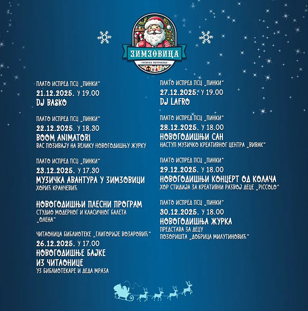 Vesti Zimzovica: Bogat novogodišnji program ispred PSC „Pinki” 17/12/2025 Još iz kategorije Vesti: U pritvoru zbog sumnje u izvršenje teških krađa 16/12/2025 Međunarodna akcija pojačane kontrole saobraćaja 15/12/2025 JP „Srem-gas” omogućio onlajn dostavu stanja potrošnje gasa i unapredio digitalne usluge 15/12/2025 SREMSKA MITROVICA – U susret novogodišnjim praznicima, grad i ove godine priprema bogat i raznovrstan program u okviru manifestacije „Zimzovica”, koja će se održavati od 21. do 30. decembra na platou ispred PSC „Pinki”, kao i u prostoru Biblioteke „Grigorije Vozarović”. Posetioce svih generacija očekuju DJ večeri, dečji programi, koncerti, plesni i muzički nastupi, kao i novogodišnje predstave i bajke. Program počinje 21. decembra u 19 sati uz nastup DJ Basko, dok će već narednog dana, 22. decembra u 18.30, Boom animatori prirediti veliku novogodišnju žurku za najmlađe. U nastavku manifestacije, 23. decembra u 17.30, publiku očekuje „Muzička avantura u Zimzovici“ u izvođenju Horića „Krančević”, dok će se 26. decembra u 17 sati u čitaonici Biblioteke „Grigorije Vozarović” održati Novogodišnje bajke iz čitaonice, uz bibliotekare i Deda Mraza. Praznična atmosfera se nastavlja ispred PSC „Pinki“, uz DJ Lafro, 27. decembra u 19 sati, dok je 28. decembar u 18 sati rezervisan za program „Novogodišnji san”Muzičko-kreativnog centra „Vivak”. Posebnu pažnju privući će Novogodišnji koncert Od kolača u izvođenju Hora studija za kreativni razvoj dece „Piccolo”, zakazan za 29. decembar u 18 sati, kao i Novogodišnja žurka – predstava za decu Pozorišta „Dobrica Milutinović”, koja će biti održana 30. decembra u 18 sati.