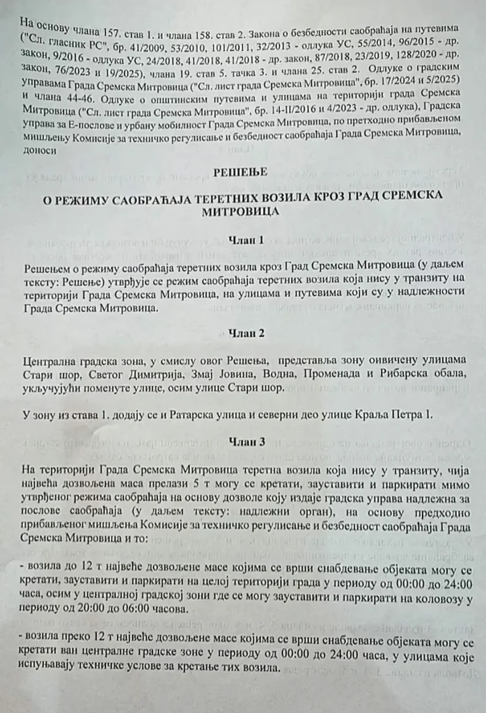 Nov režim saobraćaja teretnih vozila u Sremskoj Mitrovici utvrđen je rešenjem koje je doneo Grad Sremska Mitrovica da centralna gradska zona obuhvata prostor omeđen ulicama Stari šor, Svetog Dimitrija, Zmaj Jovina, Vodna, Promenada i Ribarska obala, uključujući navedene ulice, izuzev ulice Stari šor. U zonu jedan dodatno su uključene Ratarska ulica, kao i severni deo ulice Kralja Petra Prvog. Iz Gradske uprave poručuju da će novi režim doprineti smanjenju gužvi u centru grada, boljoj organizaciji snabdevanja i većoj bezbednosti svih učesnika u saobraćaju.